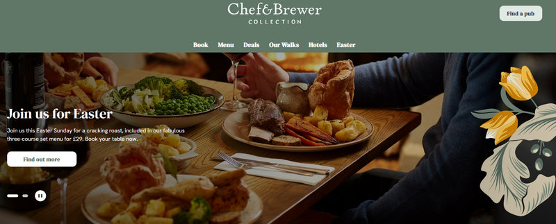 Its official pages currently highlight ongoing brand activity around spring occasions, Easter, everyday pub dining, weekend food moments, and festive planning for later in the year. The site also pushes gift cards and pub bookings, both of which are typical components of seasonal dining promotions.