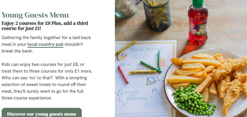 Request the "Young Guests Menu" when seating (£8 for 2 courses) |