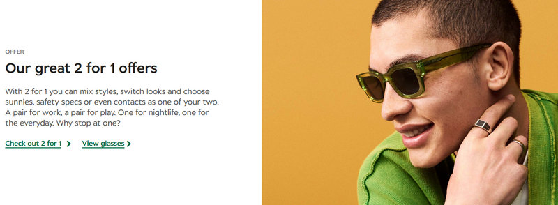 - 2 for 1 Glasses: Standard ongoing offers on selected frames.