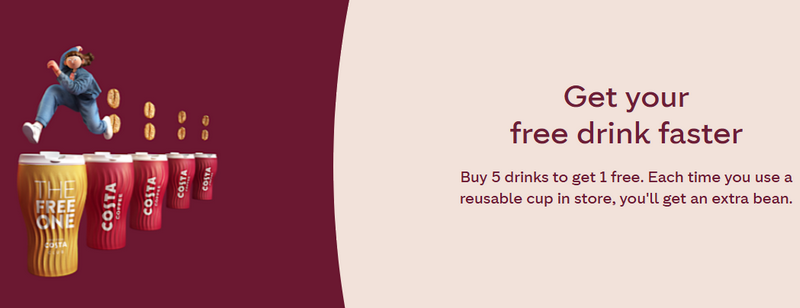 Sustainability is highly rewarded. Customers who bring a clean, reusable cup to a participating Costa store receive an extra bean per order. This effectively cuts the loyalty requirement in half, meaning a free drink is earned after just 5 purchases.