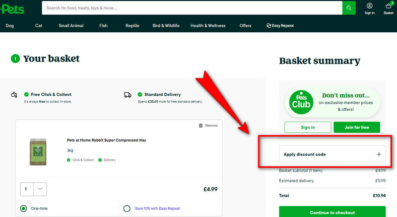 - Step 5: Review exclusions: If the code fails, verify that the basket meets any minimum spend requirements and does not contain excluded items like live pets, gift cards, or existing Easy Repeat subscriptions.